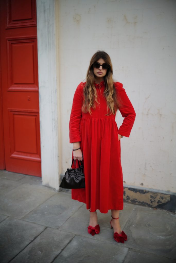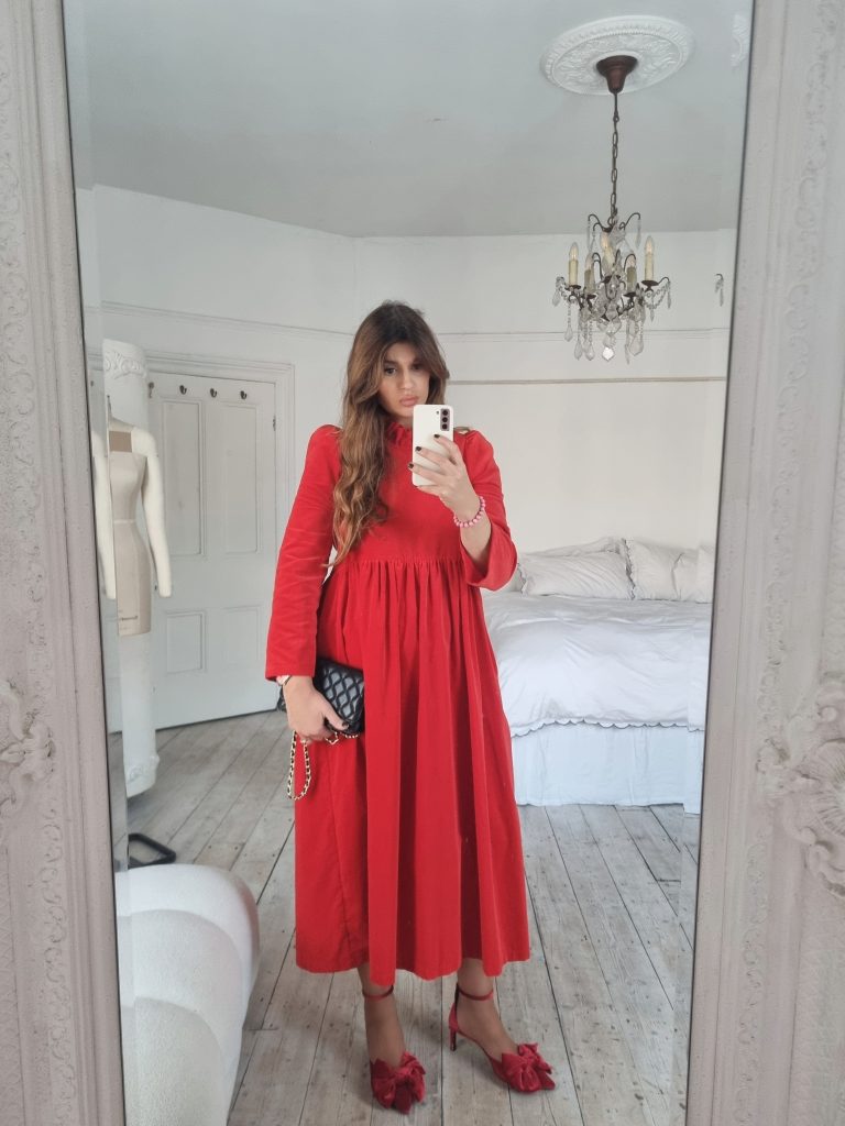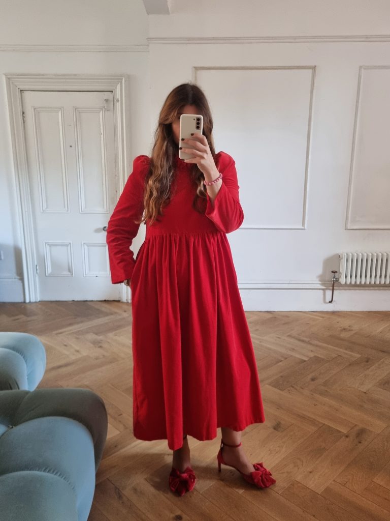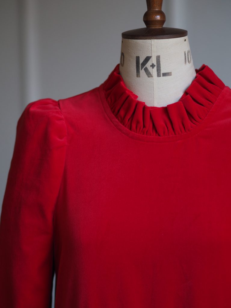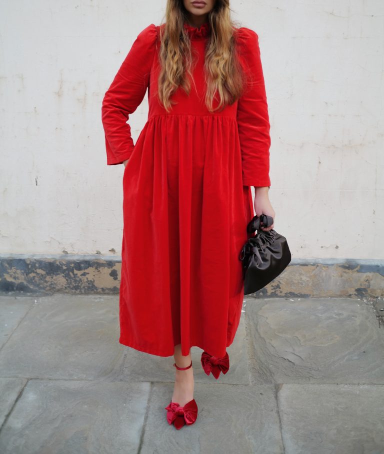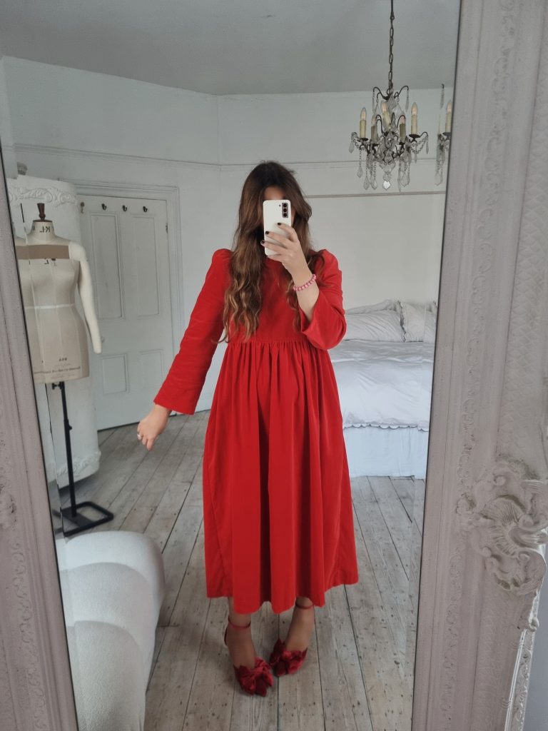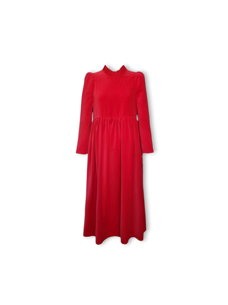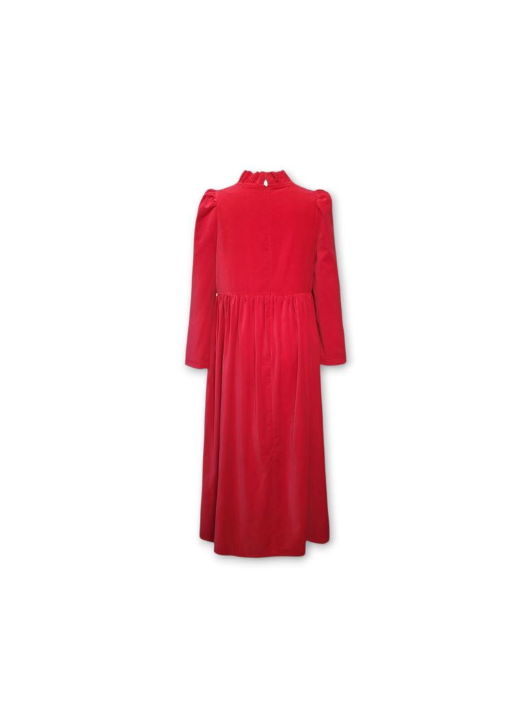 The perfect festive dress in beautiful bright red OEKO-TEX 100 cotton velvet. Loose fitting bodice with a ruffled neckline and raised waist. The Rosita dress features slightly less exaggerated shoulders than the original Rosa dress and bracelet length, loose fitting, softly structured puffed sleeves. Gathered midi skirt with side pockets. Back concealed zip. Length of size 10 from centre back neck to hem is 121cm.