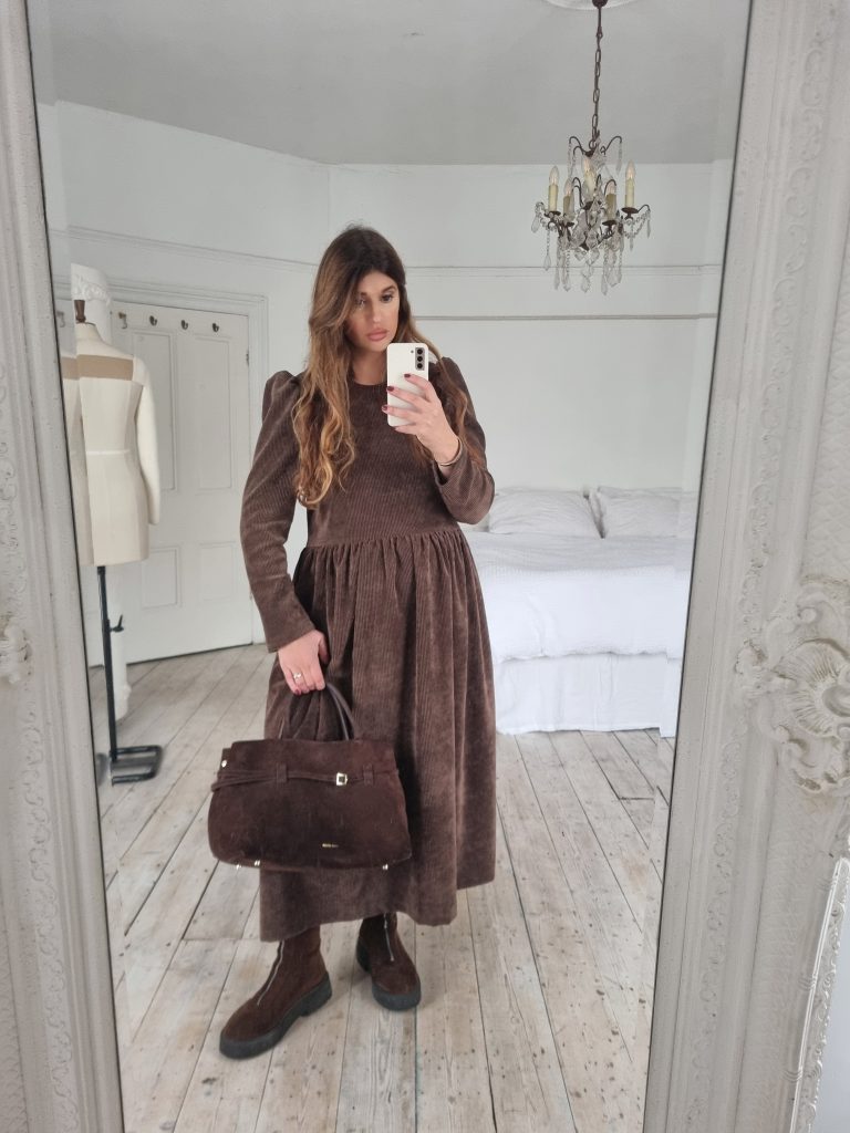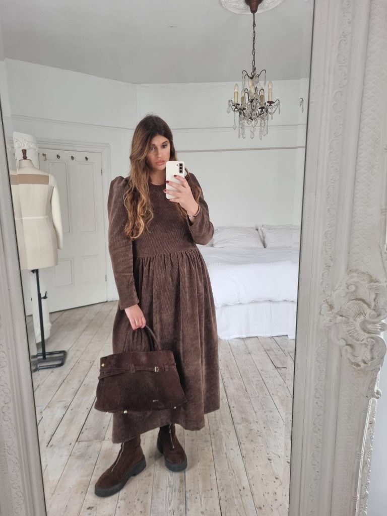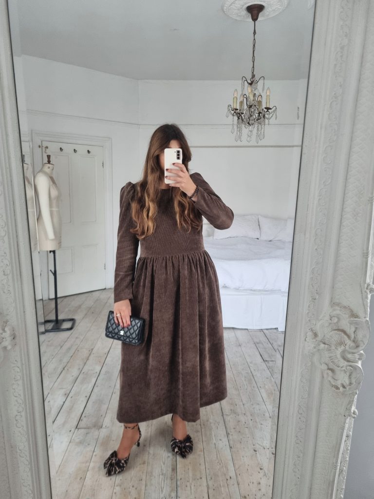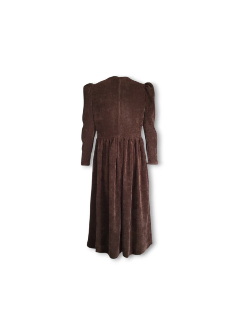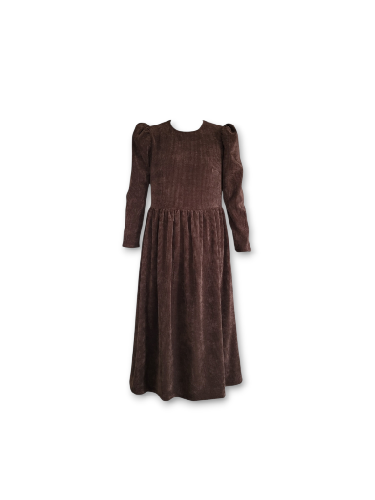 This Dolce dress is made from a soft chocolate brown OEKO-TEX 100 corduroy with a slight stretch, it is the perfect day to night dress. It has a longer bodice than the Rosa dress for a more waisted look and darts at the bust for shaping. Relaxed fit to the bodice, finishing at the natural waist with a round neckline and long slim puffed sleeves. Gathered skirt with side pockets and back concealed zip. Please note this dress is unlined. True to size with a relaxed fit at the waist. Size down if you are in between sizes or have smaller bust.