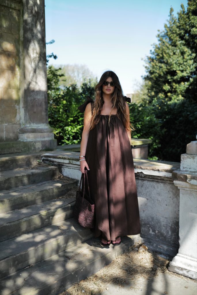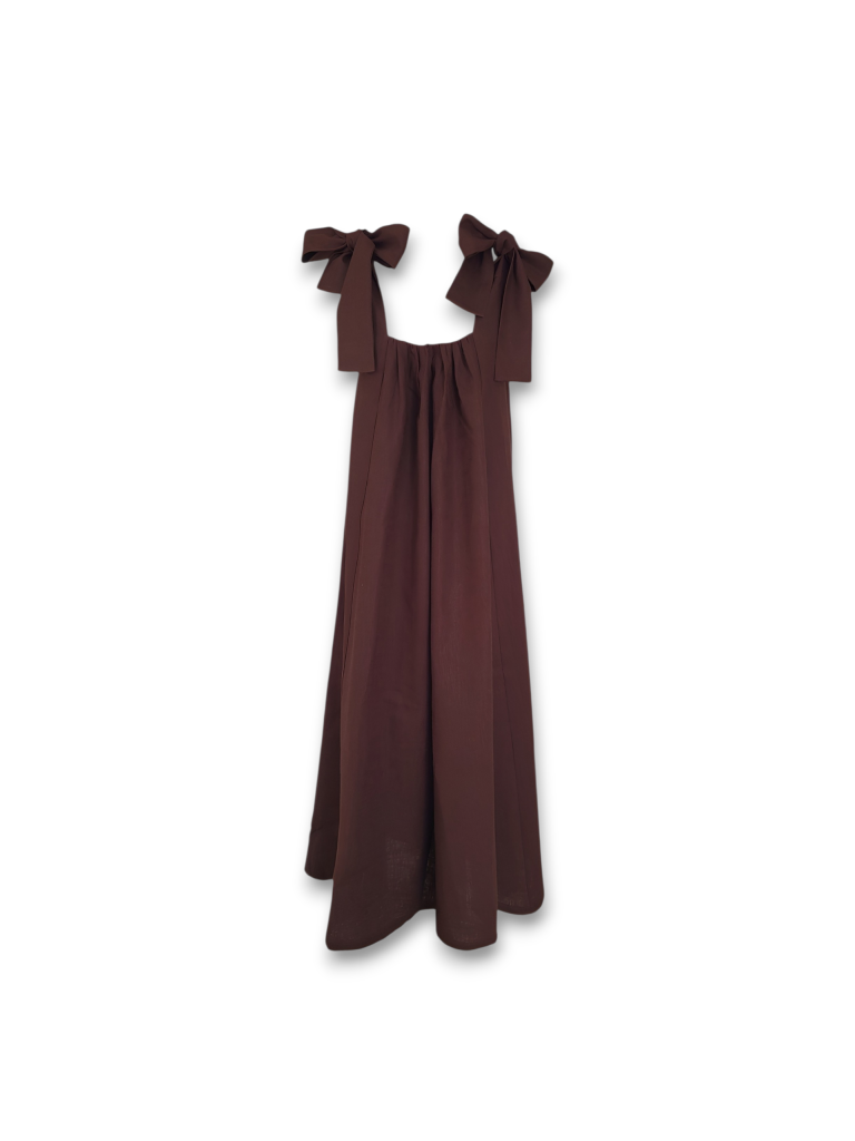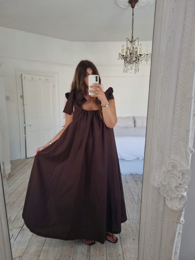 The perfect summer statement maxi dress made from a beautiful dark brown OEKO-TEX 100 linen. Square necked, oversized dress with tie shoulder straps styled in bows. Loose fitting , vintage inspired shape. Pulls on, with side pockets. Can be worn with a strapless bra.