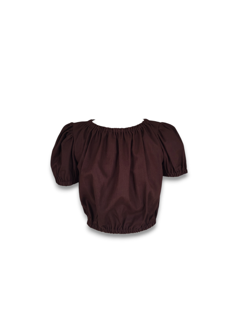 Loose fitting blouse has gathered, elasticated round neck, short puffed elasticated sleeves and waist length elasticated hem.