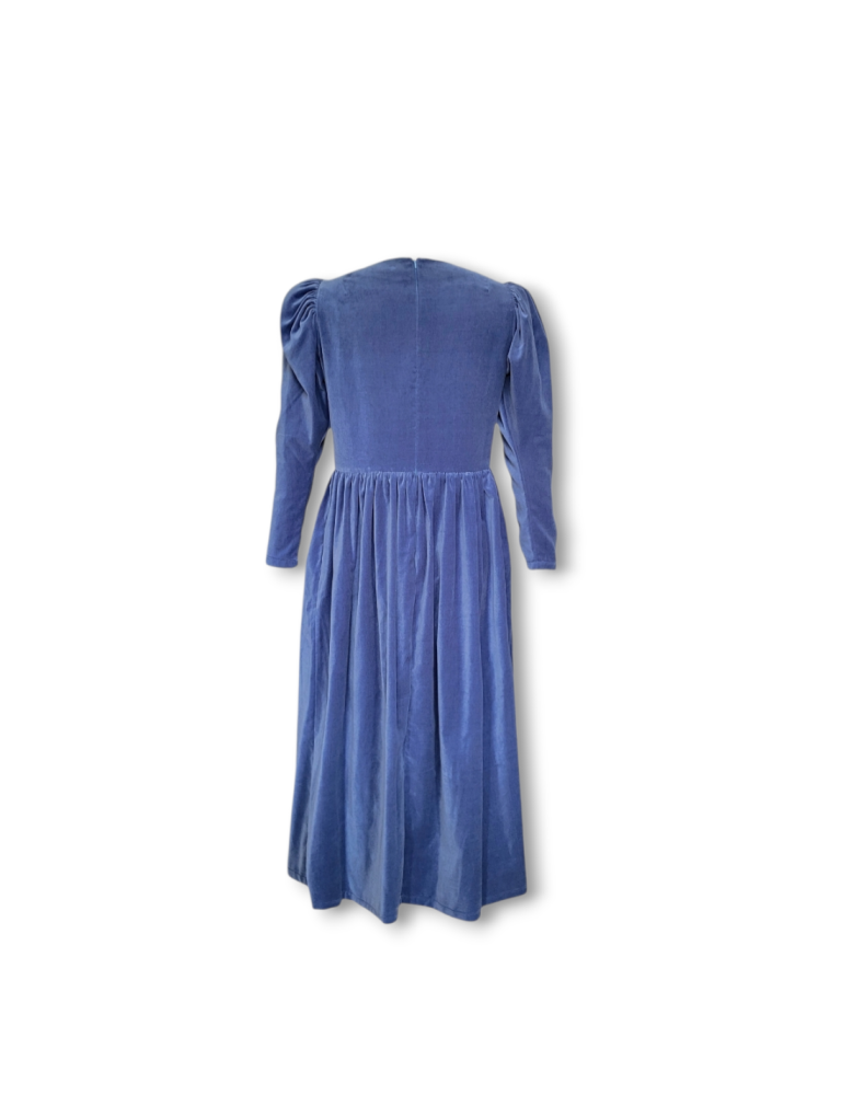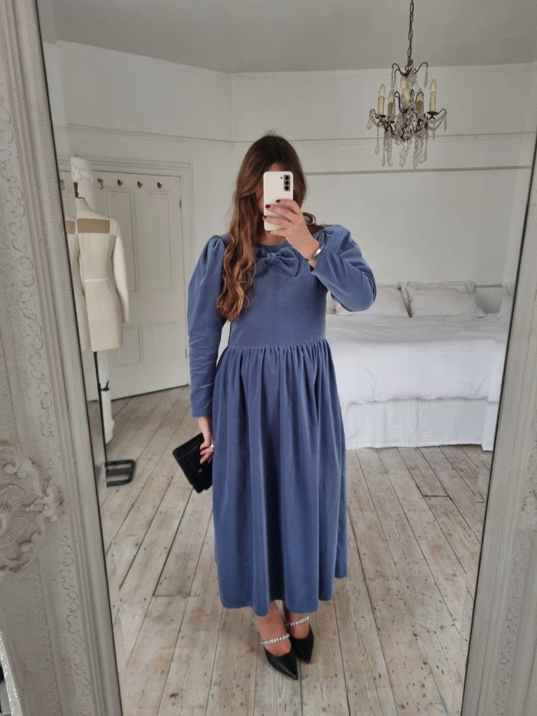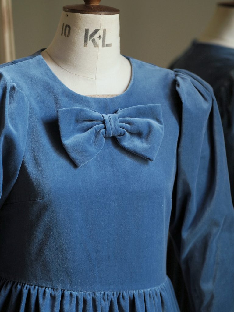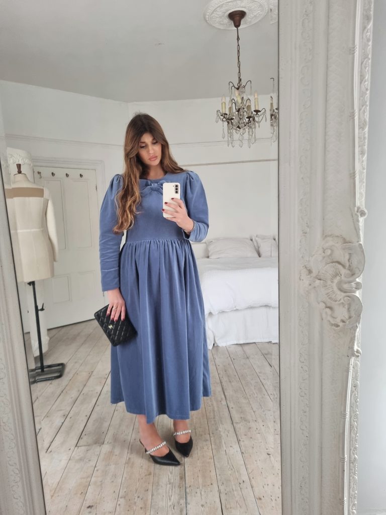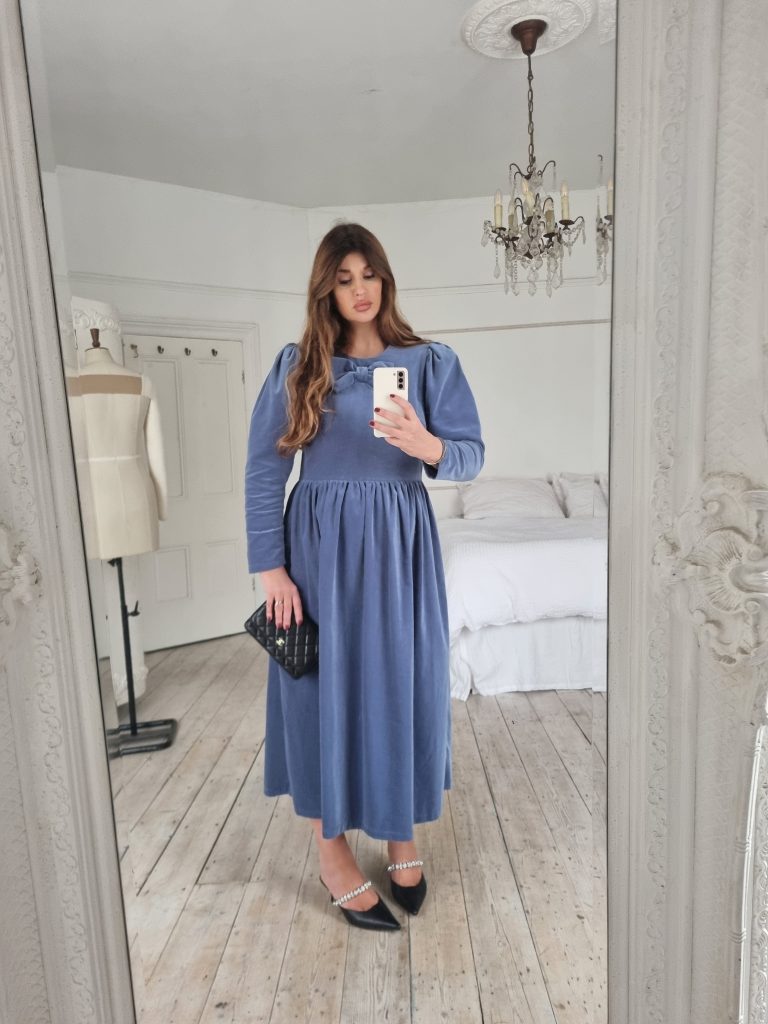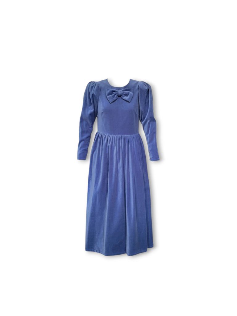 This Noa dress is made from a beautiful soft dusty blue cotton velvet, it is the perfect day to night dress for the festive season. It features a round neckline with a beautiful signature JS bow and oversized leg of mutton puffed sleeves. Designed to be slightly fitted at the bust and waist without compromising on comfort. Gathered skirt with side pockets and back concealed zip. True to size, take your normal size for a comfortable fit or if you are between sizes with a smaller bust take the size smaller.