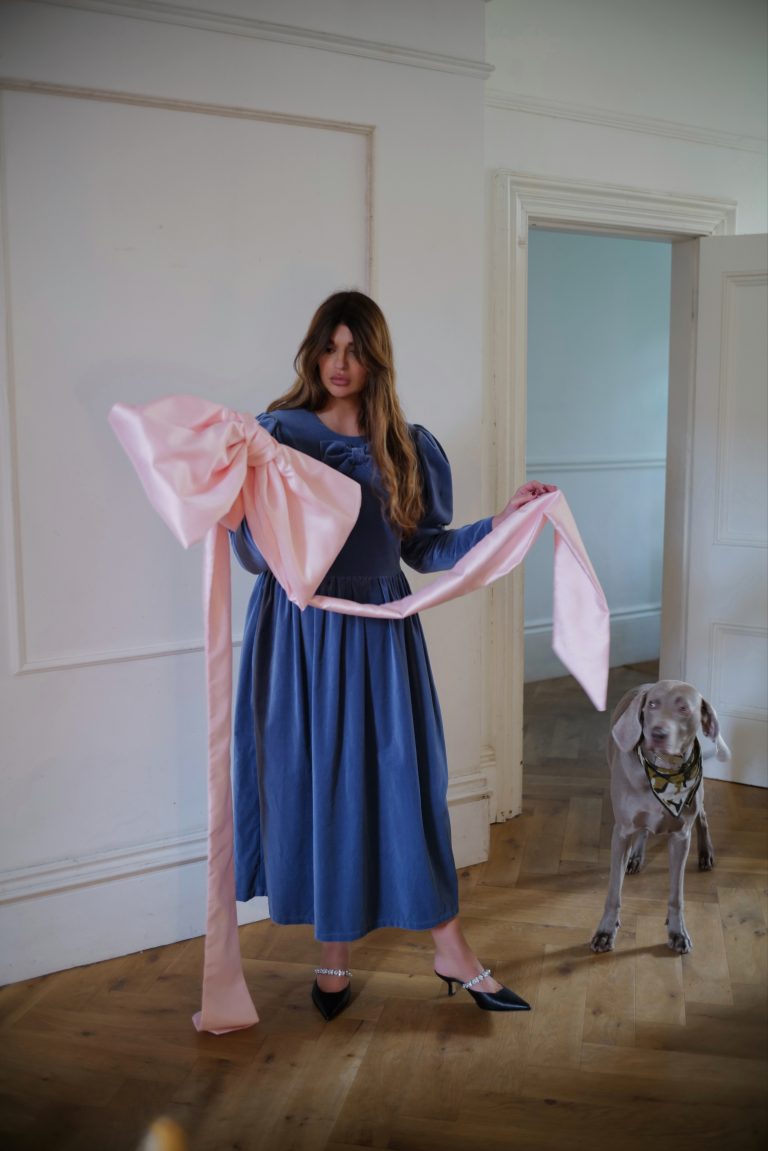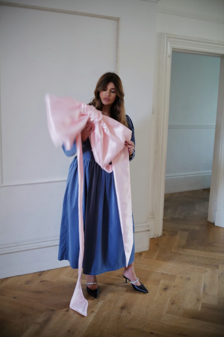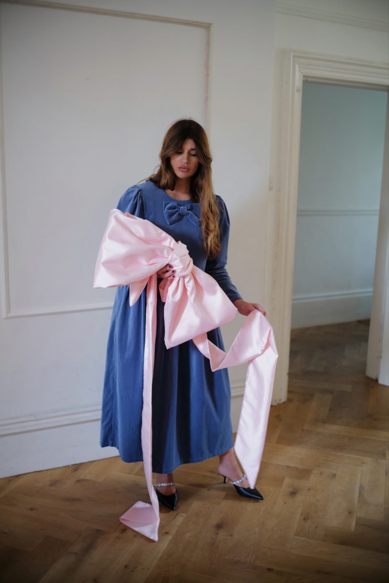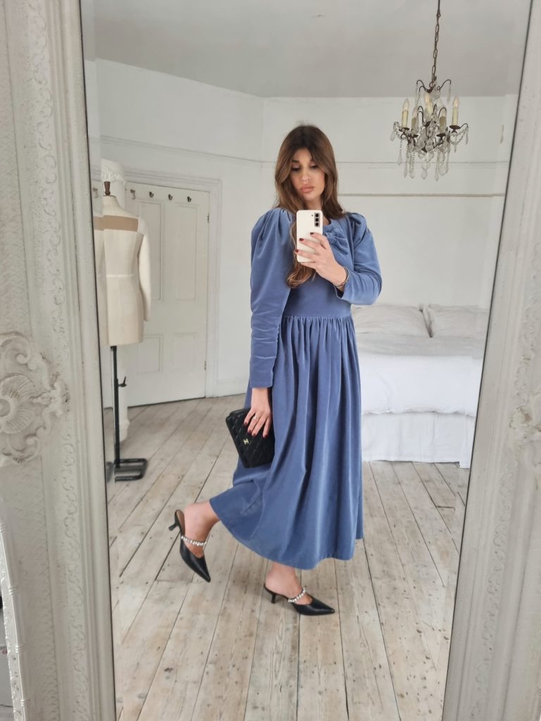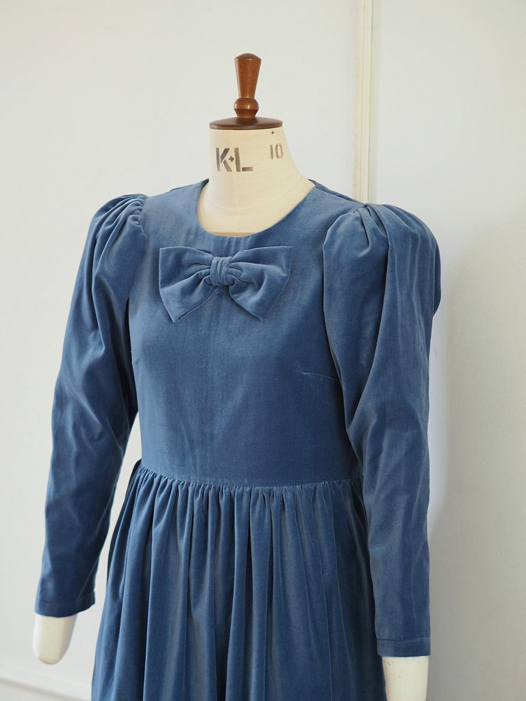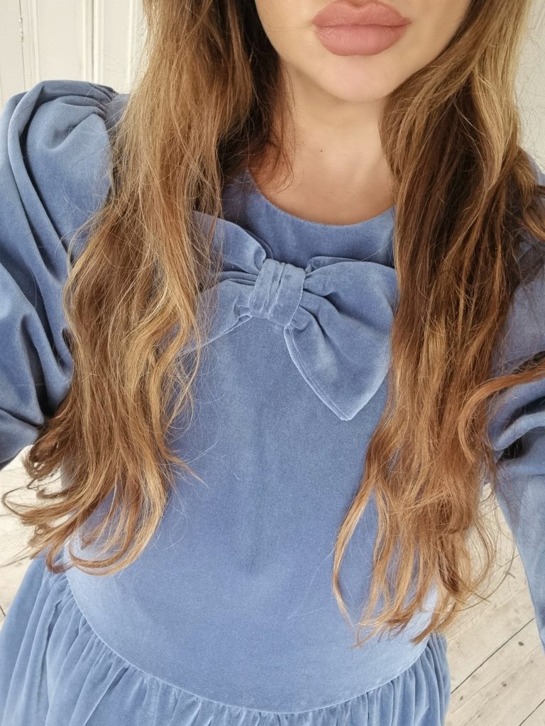 This Noa dress is made from a beautiful soft dusty blue cotton velvet, it is the perfect day to night dress for the festive season. It features a round neckline with a beautiful signature JS bow and oversized leg of mutton puffed sleeves. Designed to be slightly fitted at the bust and waist without compromising on comfort. Gathered skirt with side pockets and back concealed zip. True to size, take your normal size for a comfortable fit or if you are between sizes with a smaller bust take the size smaller.