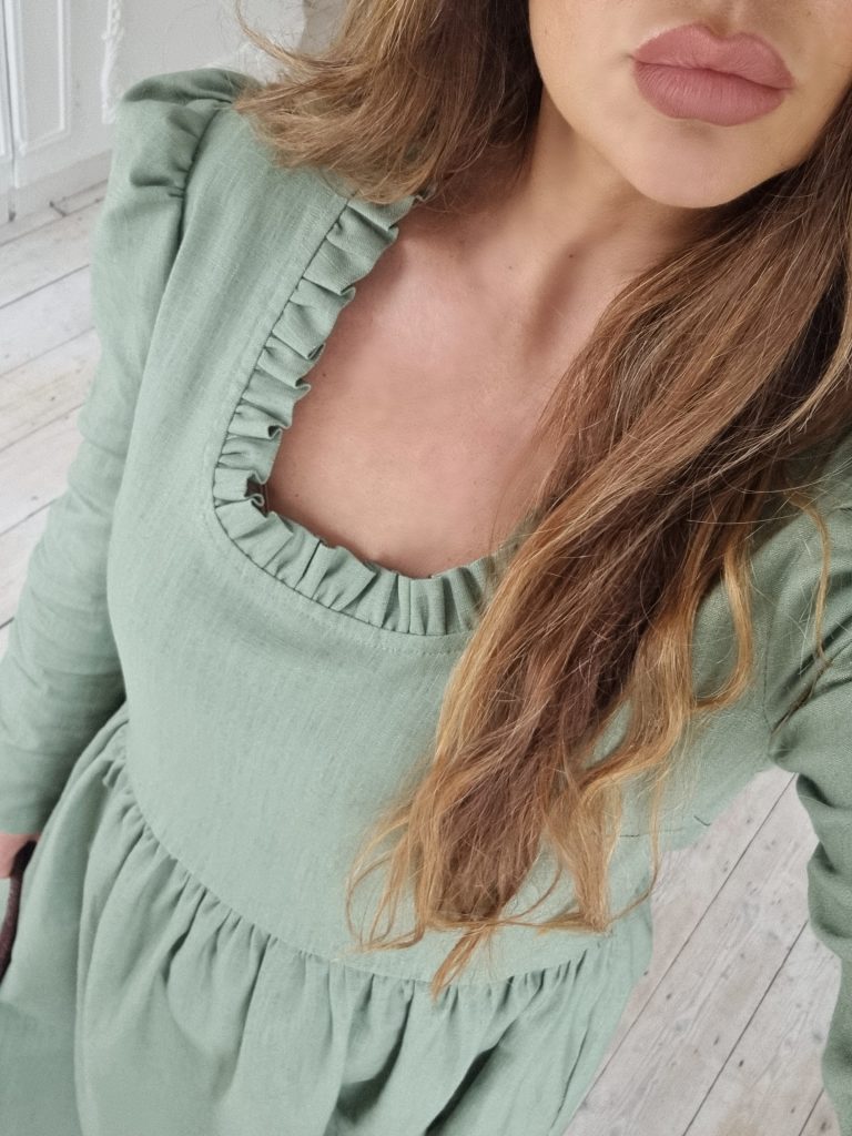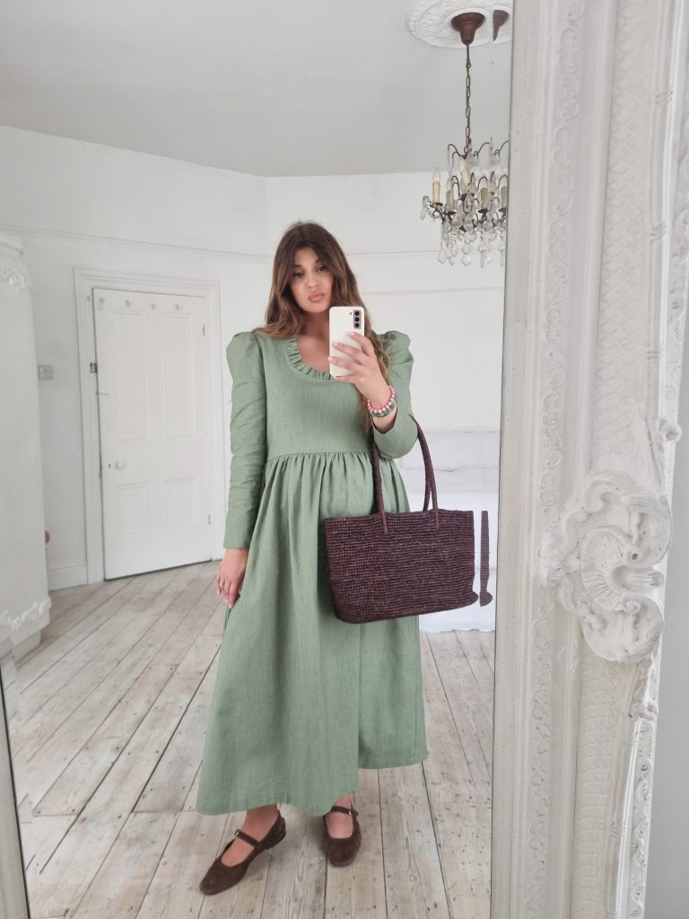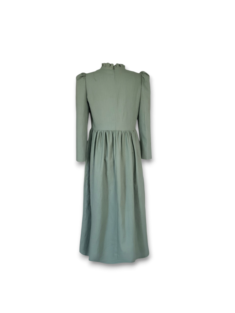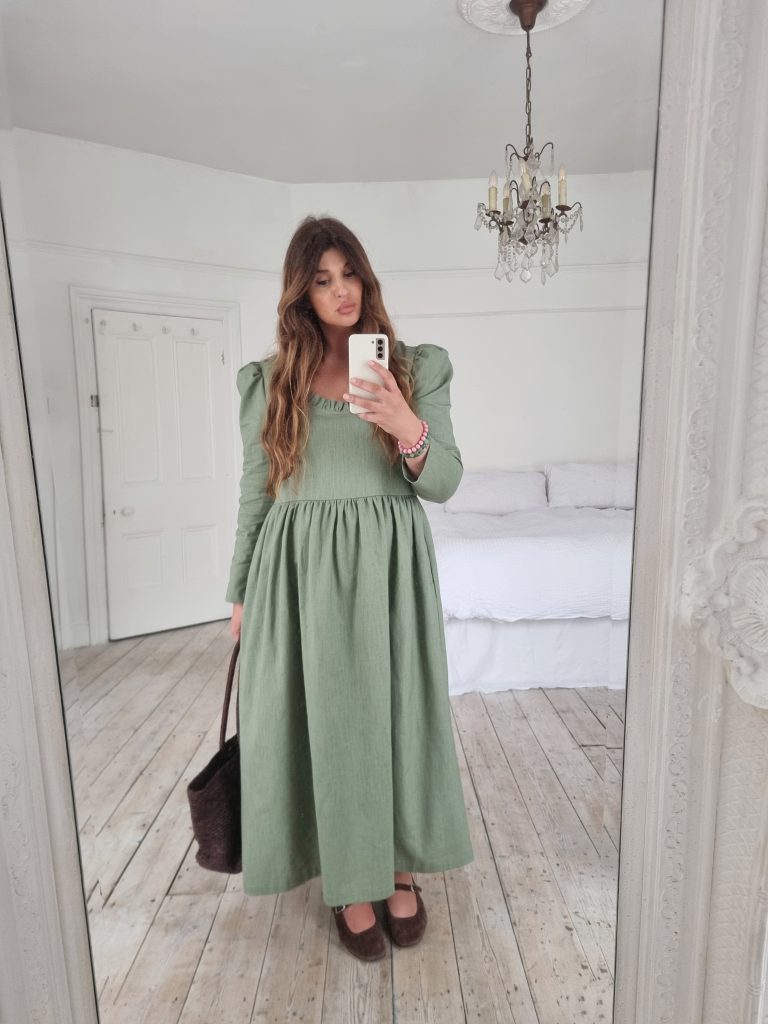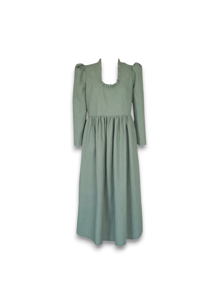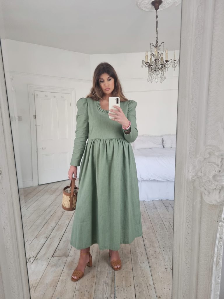 The Positano dress is the perfect spring/summer dress made from a beautiful olive green linen fabric. It has a relaxed fit which is enhanced by bust darts and a semi fitted bodice finishing at the natural waist. It features a scoop neckline with a ruffle and tapered bracelet length puffed sleeves. Gathered skirt with side pockets and back concealed zip. If you prefer a more fitted look or have a smaller bust take a size smaller. Please check garment measurements below. Please note this dress is unlined.