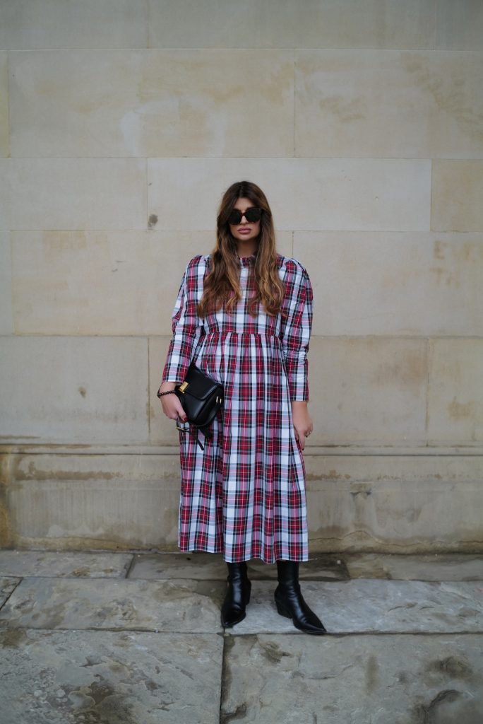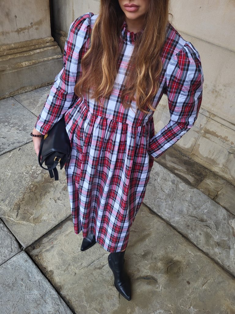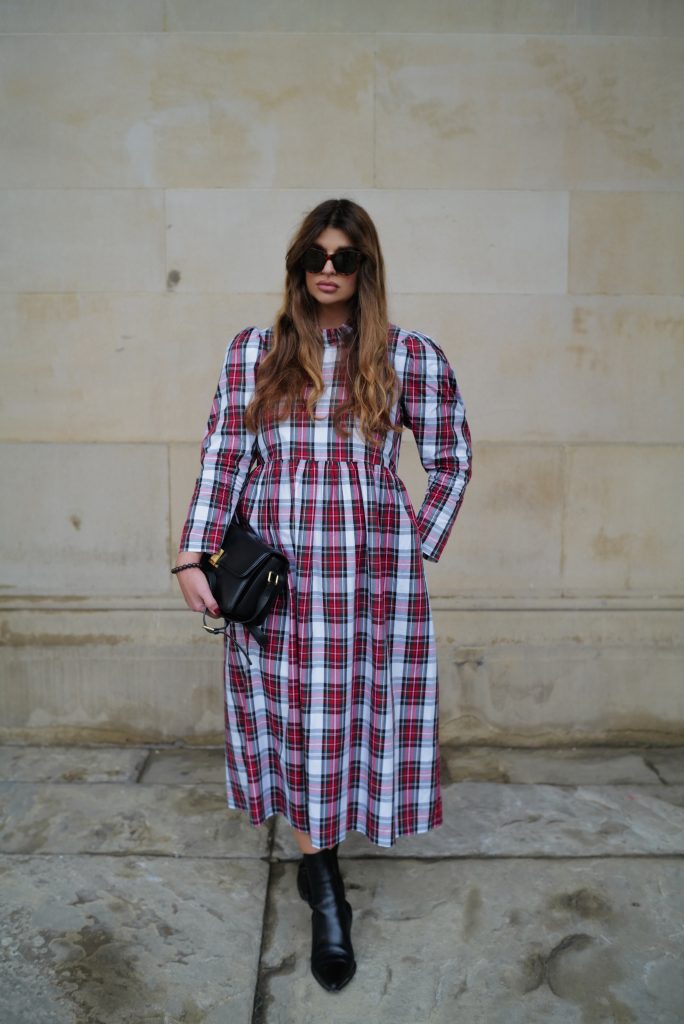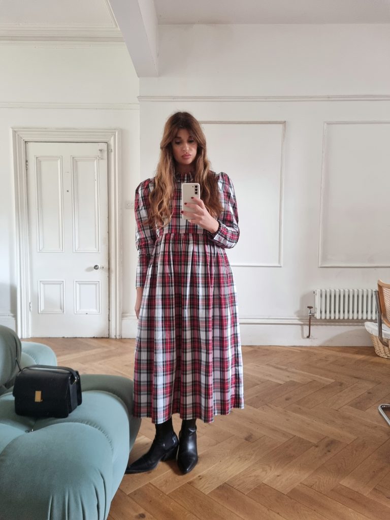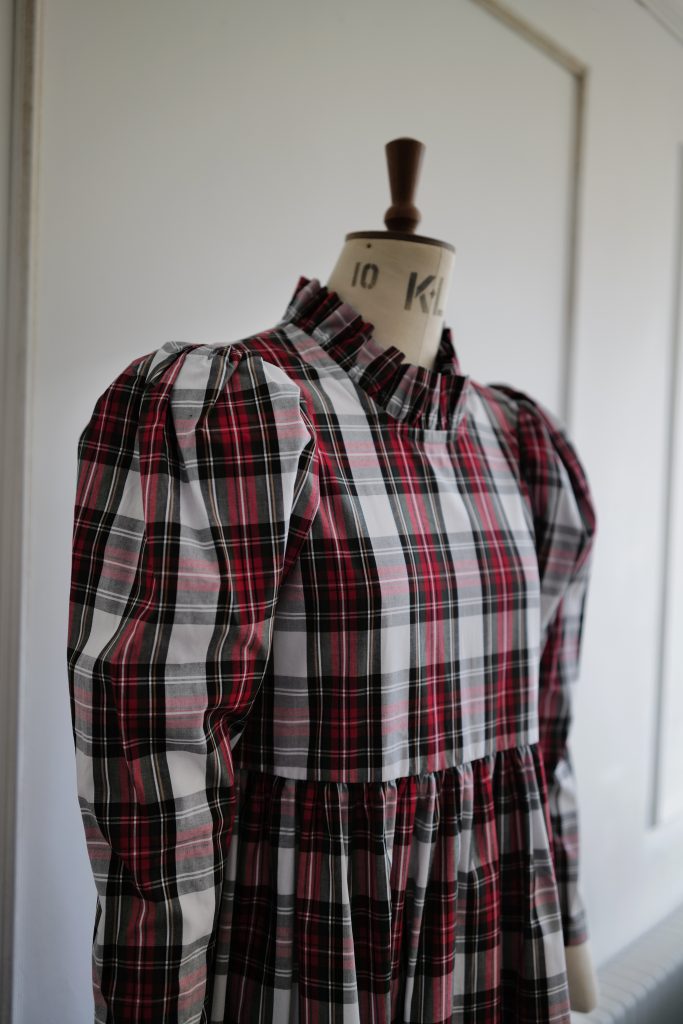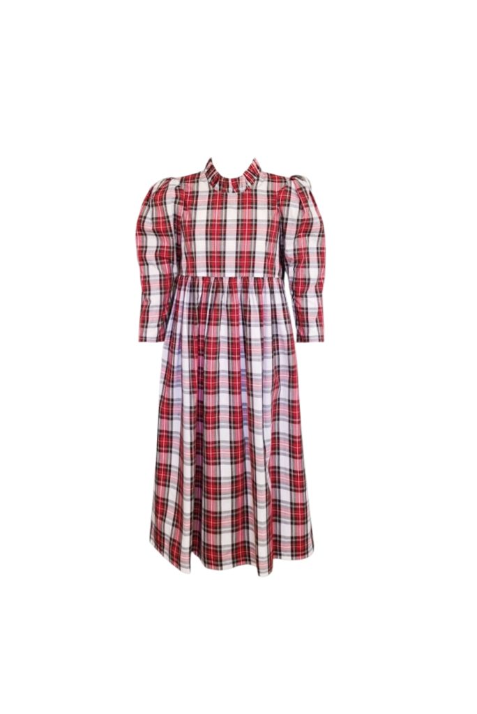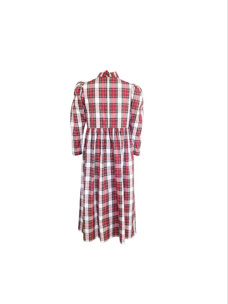 The perfect festive dress in a beautiful mid weight, white tartan cotton. Loose fitting bodice with a raised waist and ruffled neckline. The original Rosa dress features exaggerated shoulders and softly structured leg-of-mutton sleeves which taper towards a slim wrist. Gathered midi skirt with side pockets. Back concealed zip. Length of size 10 from centre back neck to hem is 121cm.