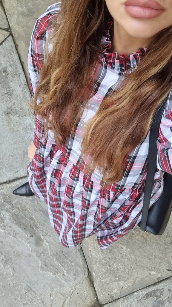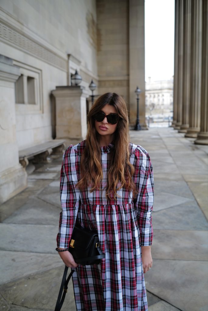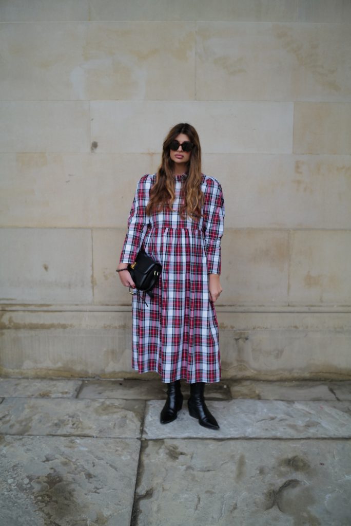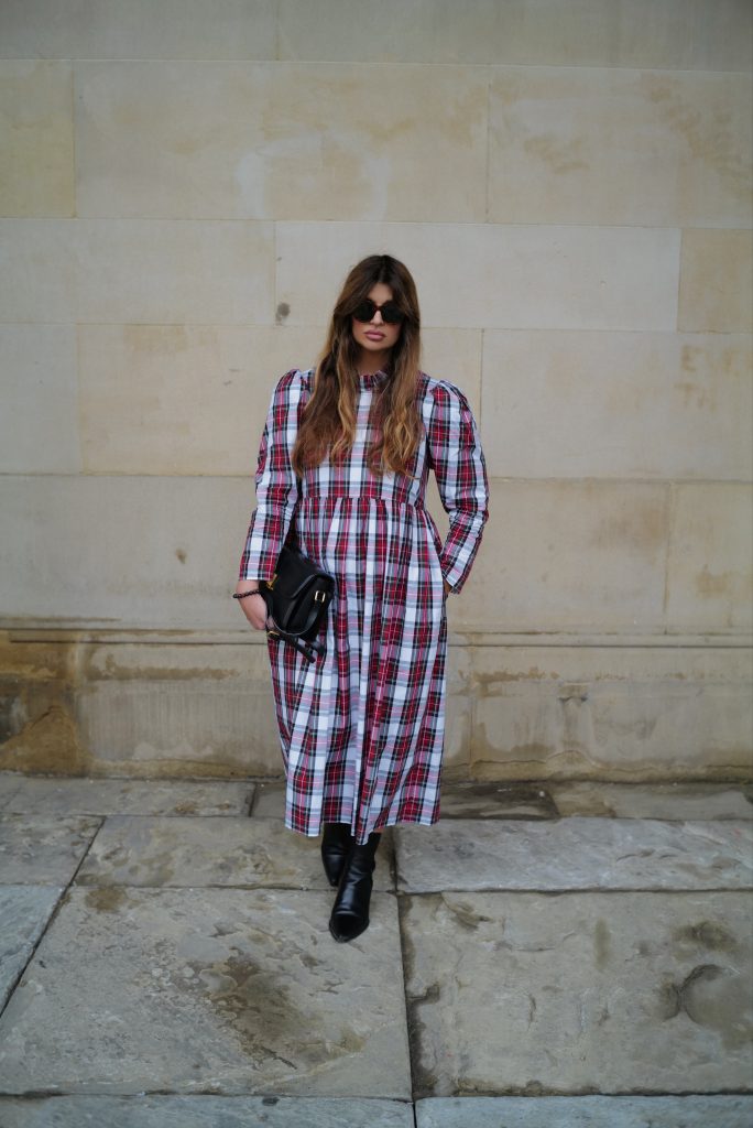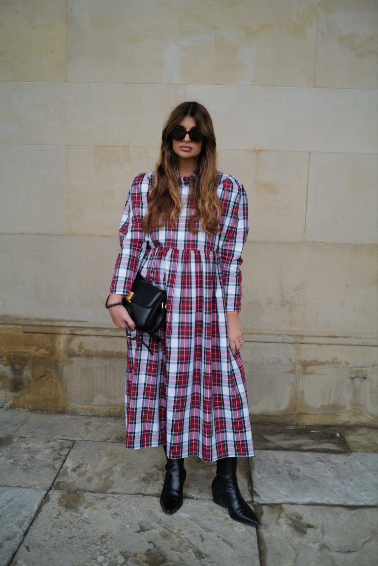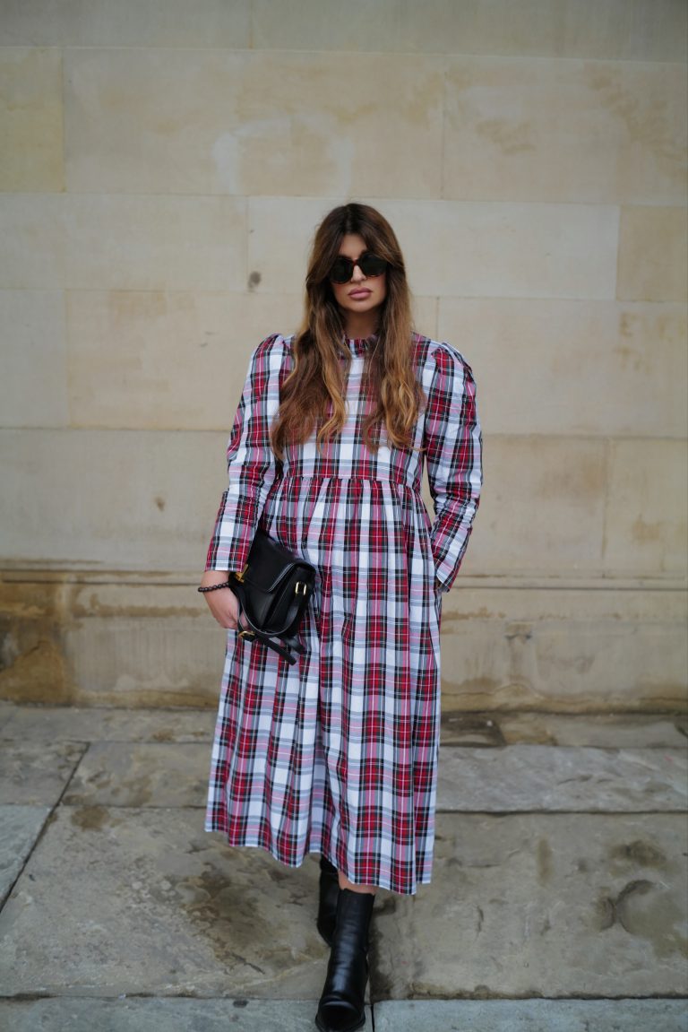 The perfect festive dress in a beautiful mid weight, white tartan cotton. Loose fitting bodice with a raised waist and ruffled neckline. The original Rosa dress features exaggerated shoulders and softly structured leg-of-mutton sleeves which taper towards a slim wrist. Gathered midi skirt with side pockets. Back concealed zip. Length of size 10 from centre back neck to hem is 121cm.