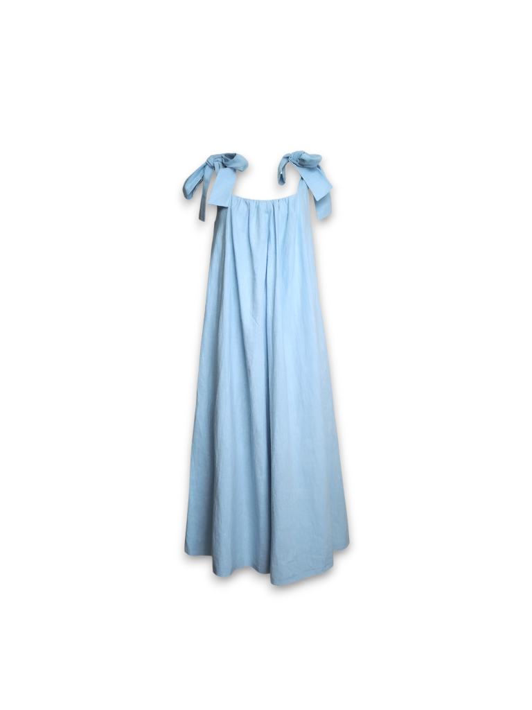 The perfect summer statement maxi dress. Square necked, oversized dress with tie shoulder straps styled in bows. Loose fitting , vintage inspired shape. Pulls on, with side pockets. Can be worn with a strapless bra.