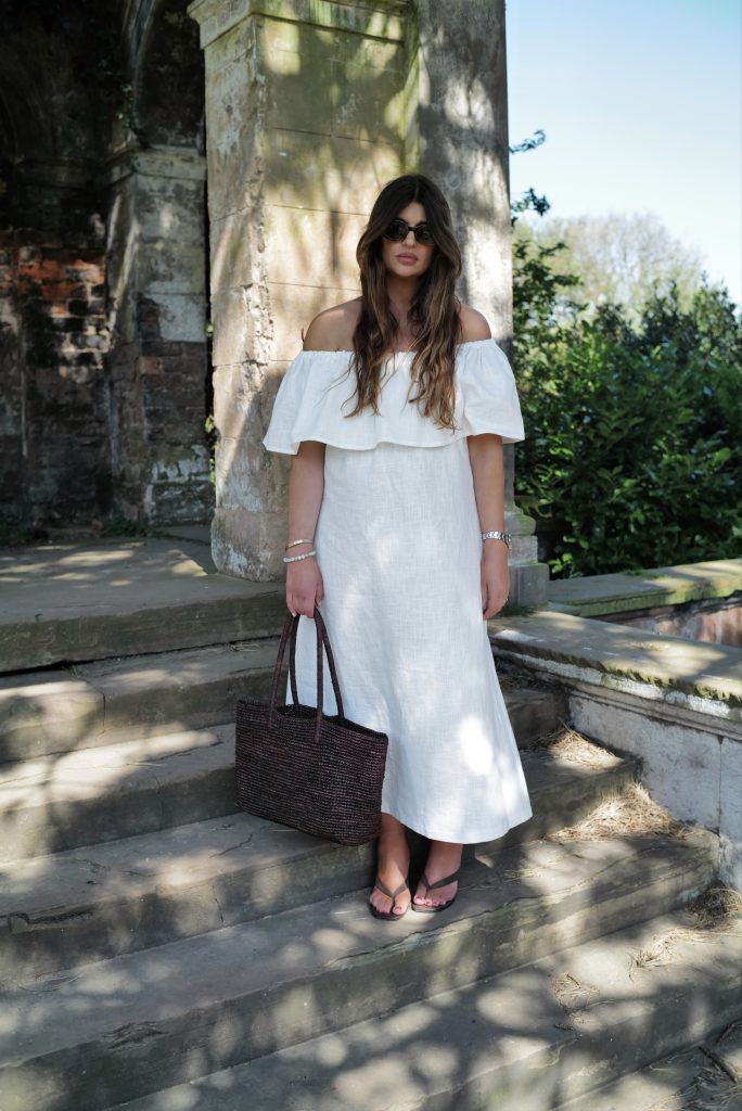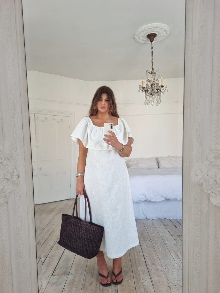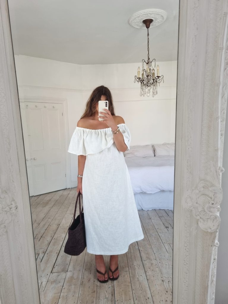 The perfect summer dress made from ivory linen, featuring a gathered, ruffled neckline which can be worn off the shoulder in a Bardot style or on the shoulder to create a square neckline. Loose fitting, vintage inspired shape with a back tie which can be adjusted to cinch the waist in. Pulls on, with side pockets. Can be worn with a strapless bra. Size 12 back length measures 111 cm.